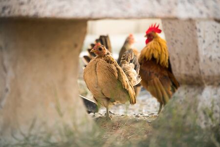Hen Is Searching Food In The Ground. Free range chicken on an organic farm, freely grazing on a meadow. Organic farming, animal rights, back to nature concept.