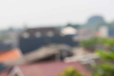 Jakarta Cityscape with high rise, skyscrapers and red tile hip roof local buildings with fog and evening sky in background.