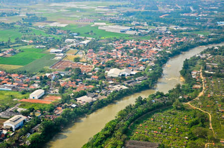 JAKARTA, Indonesia - January 13, 2020: Aerial view of flood flowing through the housing in Jakarta city at day time