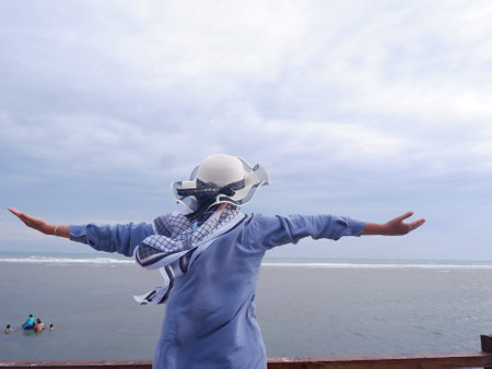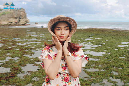 A young cute Asian girl wearing a sun hat is relaxing on the blue sky beach at Gunungkidul, Indonesia