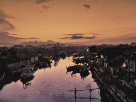 Aerial view of Karang Bolong Beach and Its Wonderful Sunset View. At anyer beach with noise cloud and cityscape. Banten, Indonesia, March 3, 2021