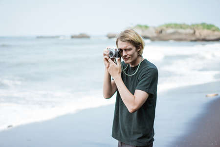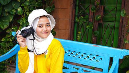 Asian woman traveling sitting with a camera was smiling wearing jilbab and analog camera