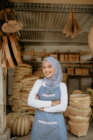 happy smiling beautiful young woman seller wearing hijab crossed her arm and looking at camera