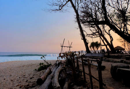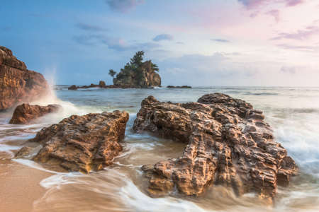 Dramatic Seaside Landscape with Long Exposure, Smooth Wave, Rocks and Sunset in Yogyakarta, Indonesia