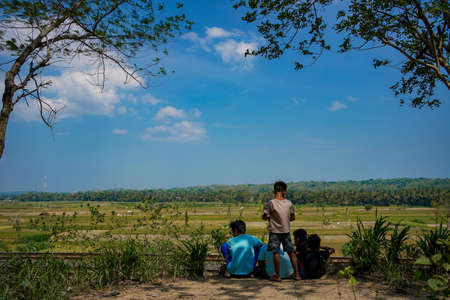 West Java, Indonesia - April 12, 2018: Indonesian schoolchildren walk along a rural road