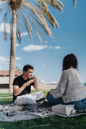 Young friends enjoying a relaxed picnic under palm trees on a sunny day near the beach.