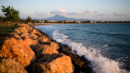 A scenic coastal landscape featuring large, sunlit rocks in the foreground with ocean waves splashing against them. In the distance, a majestic volcano rises against a clear sky.