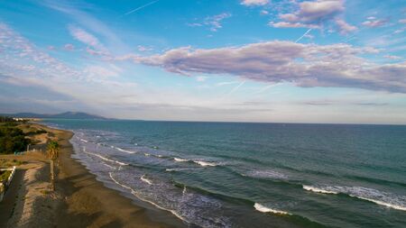 Marbella coastline with wide sandy beach by the Mediterranean Sea in Spain, Malaga province, Andalusia region.