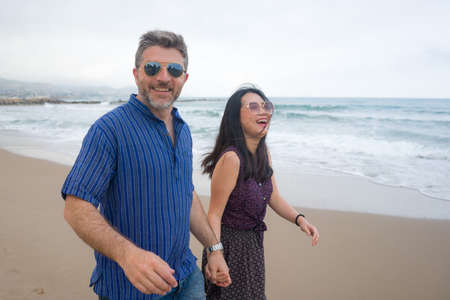 young beautiful and happy mixed ethnicity couple of Asian woman and Caucasian man relaxed and cheerful walking playful on beach enjoying love and romantic holidays