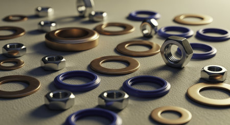 Assortment of copper colored metal washers, shiny chrome nuts, and vibrant blue rubber seals scattered on a neutral surface, showcasing industrial hardware components.