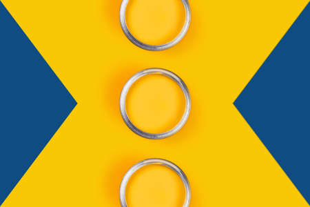 A vibrant collection of shiny gold wedding bands arranged neatly on a cheerful yellow background. Ideal for themes of love, unity, and elegance.