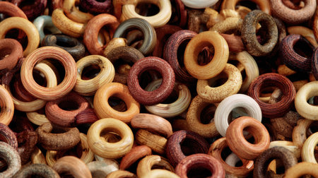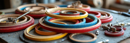 Colorful wooden rings and metal tools on workbench. That the image is generated using AI.