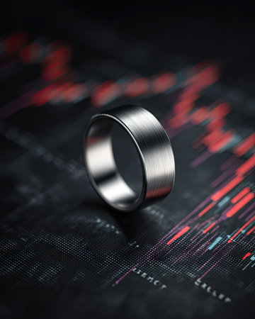 A metallic ring is positioned on a dark, textured surface, with hints of red and blue graphical elements in the background. The composition showcases a studio-style setup, with attention to detail and lighting. This image can be suitable for advertising, conceptual illustrations, or design projects.