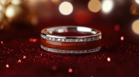 A stunning wooden ring featuring diamond accents, set against a shimmering red background, perfect for gifts or special occasions, showcasing elegance and style.