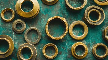 A stunning arrangement of vintage metal washers and rings showcasing diverse shapes and textures against a beautifully worn surface.