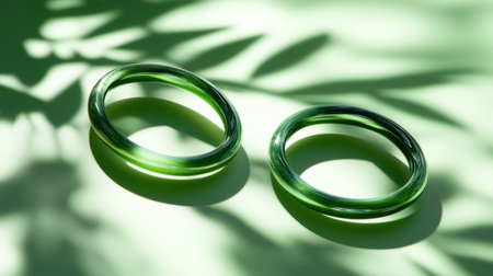 This image showcases two elegant green glass rings set against a soft green background, enhanced by natural shadows, perfect for fashion and jewelry themes.