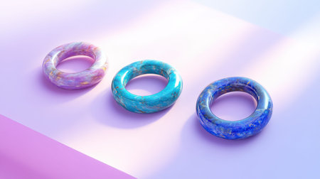 This image features three colorful marble rings arranged on a soft pastel background, highlighting modern design and artistic expression in jewelry.