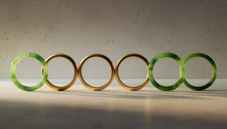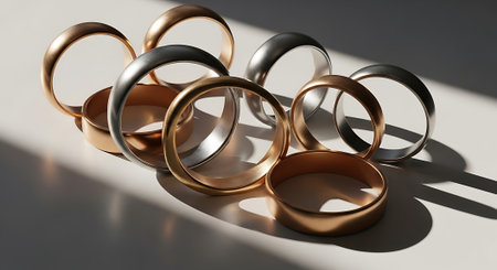 Close-up view of interlocking golden rings with a high gloss finish, set against a textured background. The play of light and shadow enhances their elegance and charm.