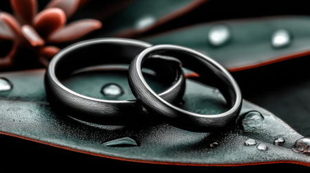 Macro shot of two wedding bands on a dark leaf with fresh water droplets. A symbol of marriage, love, and unity in a natural, romantic setting.