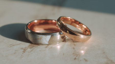 Beautifully crafted wedding rings lie on a smooth marble surface, capturing the essence of love and commitment in a timeless design.