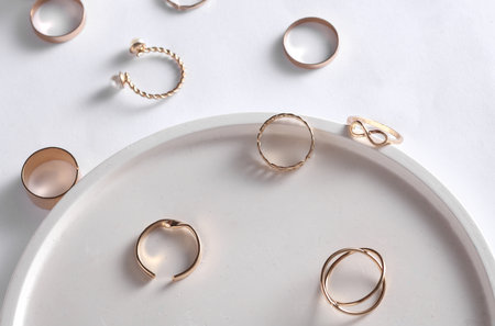 Gold rings of different shapes with plaster tray on white background. Podium showcase for product presentation. Women's jewelry store concept. Creative layout