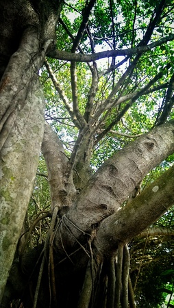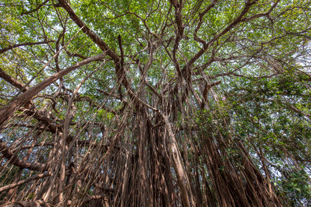 Ficus benghalensis, banyan fig, mangroves in India, tropical evergreen tree, large canopy coverage, aerial roots, monsoon and rainforests