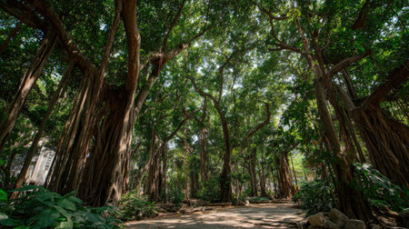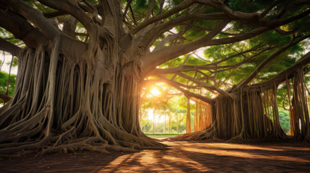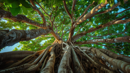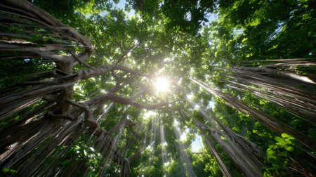 A breathtaking view looking up at massive banyan trees, showcasing intricate roots and a beautiful canopy illuminated by sunlight, evoking a sense of tranquility and connection to nature.