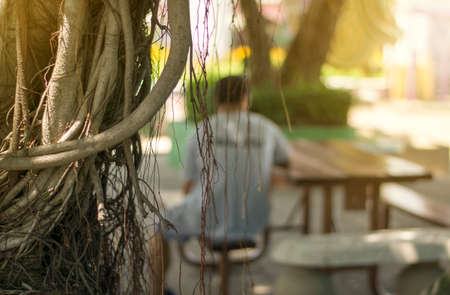 Alone man sitting on a bench under big tree try to relax with warm light of morning.very peaceful.