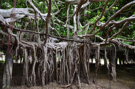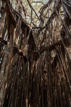 Old ancient Banyan tree with long roots that start at the top of the branches to the ground. Goa, India