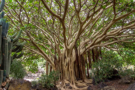 Big banyan or Indian ficus in Goa in India. A beautiful huge banyan tree in the Indian jungle near Arambol beach. Banyan, considered a sacred tree, is highly revered in India.