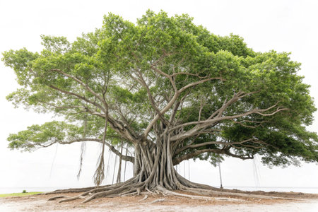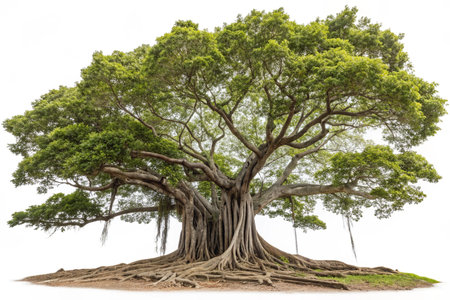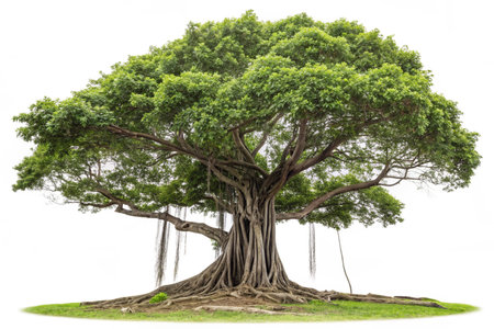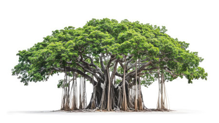Captivating banyan tree with its distinctive aerial roots, set against a clean white background.