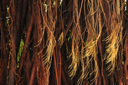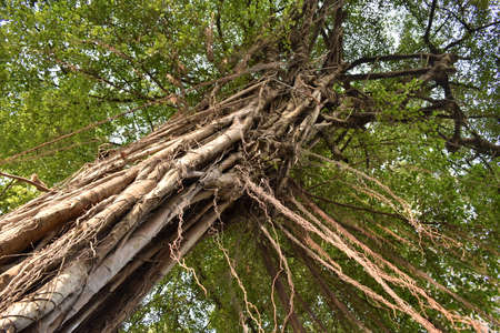 An upward shot of hanging prop roots of Banyan tree, Ficus benghalensis. Uttarakhand India.