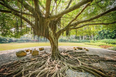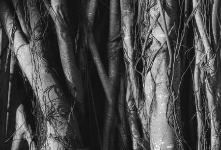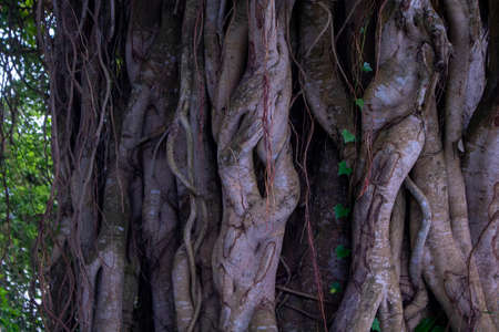 Amazing banyan tree trunk, roots and branches. City park. Shenzhen. China.