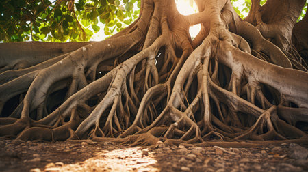 Tangled roots of a large tropical tree create a natural artwork in a vibrant green setting, illuminated by sunlight filtering through the leaves. The scene captures nature's beauty.