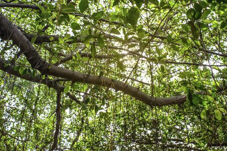 Detail of sunlight passing through small leaves on A huge banyan tree. Atmosphere of calm relaxation. Nature concept for design. Selective focus.