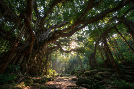 Sunlight filters through the canopy of a giant banyan tree, creating a breathtaking natural archway in a vibrant green forest