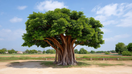 A splendid banyan tree showcasing a broad canopy and intricate aerial roots. This vibrant natural scene conveys a sense of tranquility and beauty in nature.