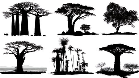 African Natural Wonder Landmark Silhouettes Set isolated on plain white background.