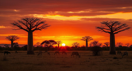 Breathtaking Madagascar landscape featuring iconic baobab trees silhouetted against vibrant orange sunset. Grazing animals create serene African wilderness scenes perfect for travel and nature content.