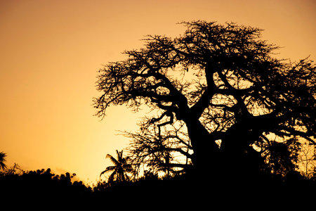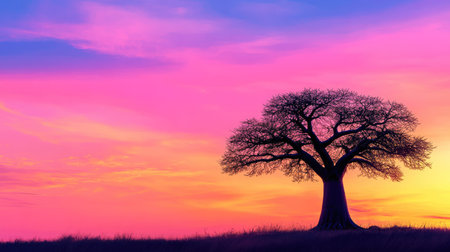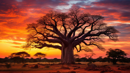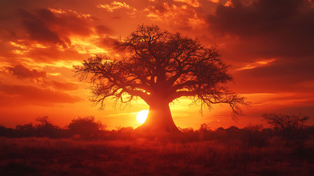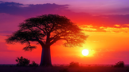 A majestic baobab tree stands in silhouette against a vibrant African sunset sky. Clear details and vibrant co...