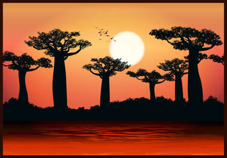 Vector illustration of baobab trees in the last rays of the sun. Seamless horizontally if needed