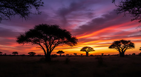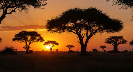 Stunning sunset silhouette of an acacia tree in the African savanna. Golden hour light creates a magical scene.