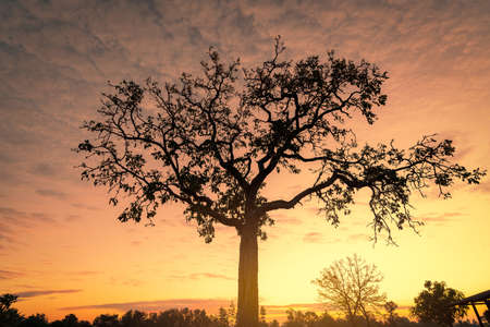 Silhouette tree with golden sunrise sky in the morning. New day with the orange sunrise sky behind the tree. Spiritual and tranquility concept. Beauty in nature. Beautiful scenery. Dusk and dawn.
