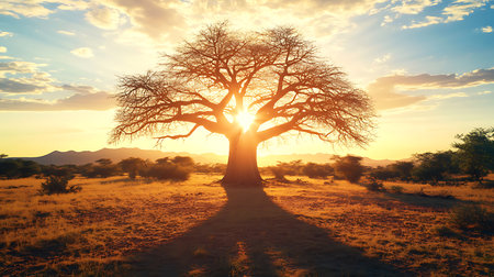 Ancient baobab tree surrounded by a golden savanna, water droplets shimmering on its thick bark after a gentle rain generative ai
