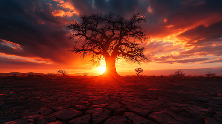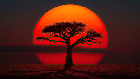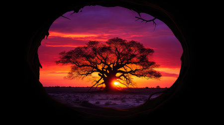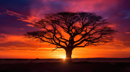 Generative AI : Dramatic African Sunset silhouette with tree
