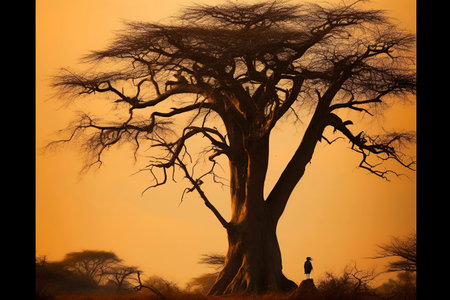 Silhouette of a baobab with an African stork. Ai generated.