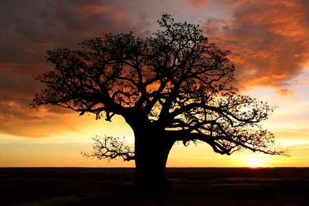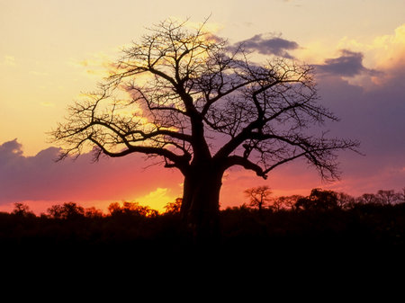 A baobab silhouetted against a sunset in Zimbabawe.