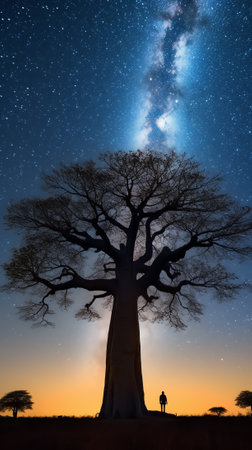 Glowing African baobab tree illuminated under a starlit sky, representing cultural legacy and resilience