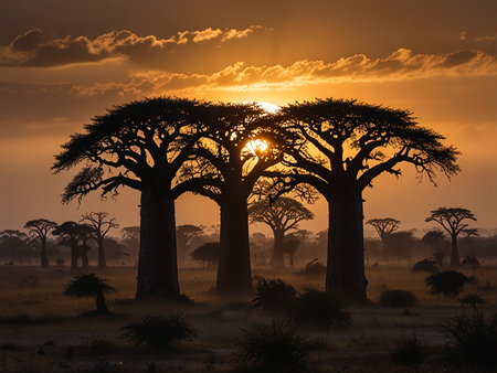 Dusk showing majestic baobab trees in madagascar during a golden hour sunset with sun flares keywords:...