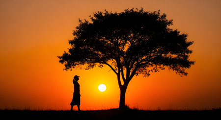 The silhouette of a woman stands beneath a large tree against a vibrant orange sunset sky. The minimalist composition conveys a sense of peace, connection with nature, and the beauty of the golden hour.